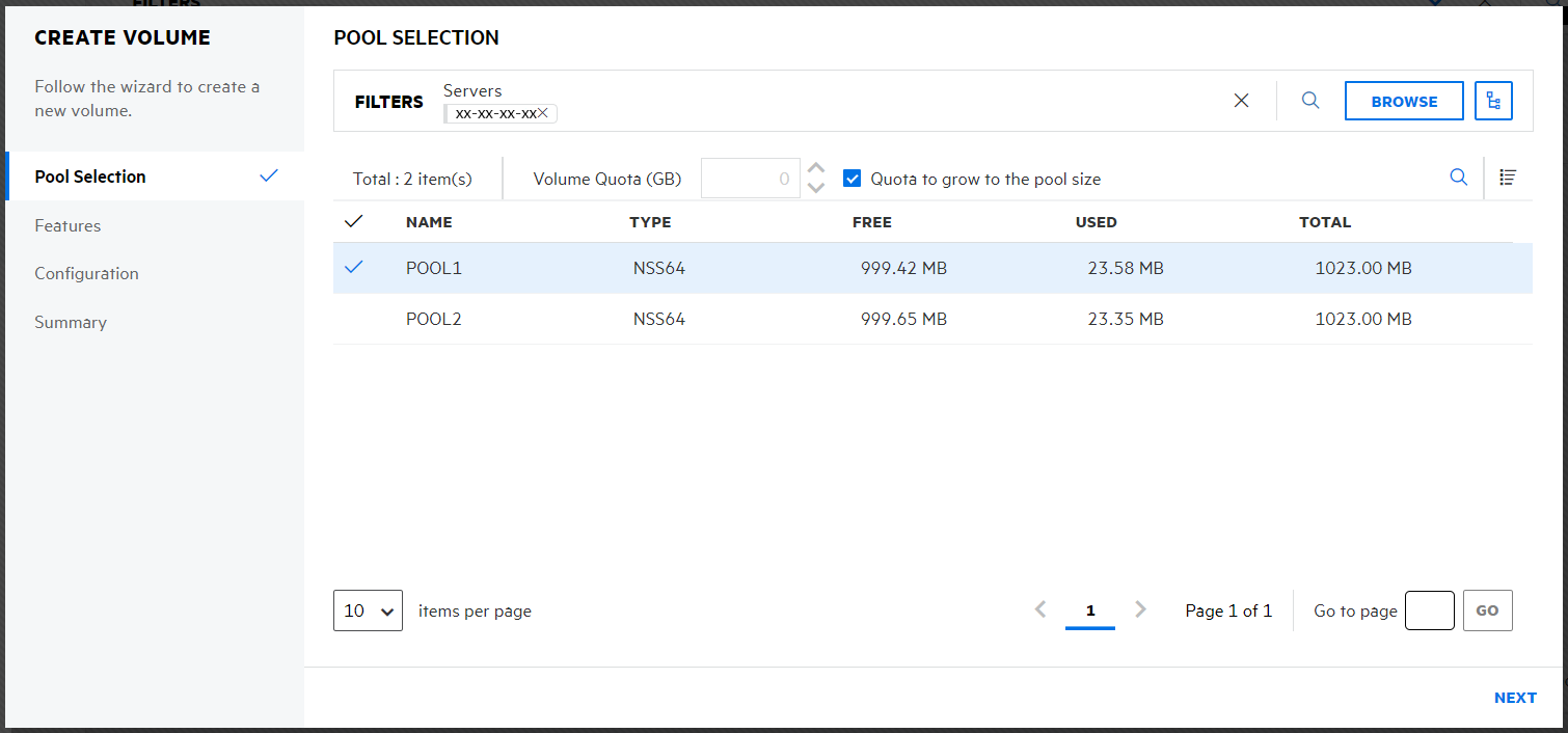 On the POOL SELECTION page, search or browse the server to select the pool where you want the new volume to reside, and click NEXT.