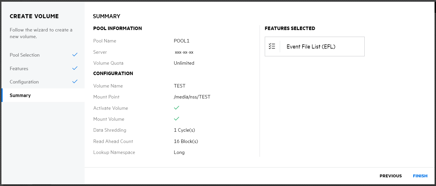 On the FEATURES page, select the features you want to enable for the new volume, and click NEXT.