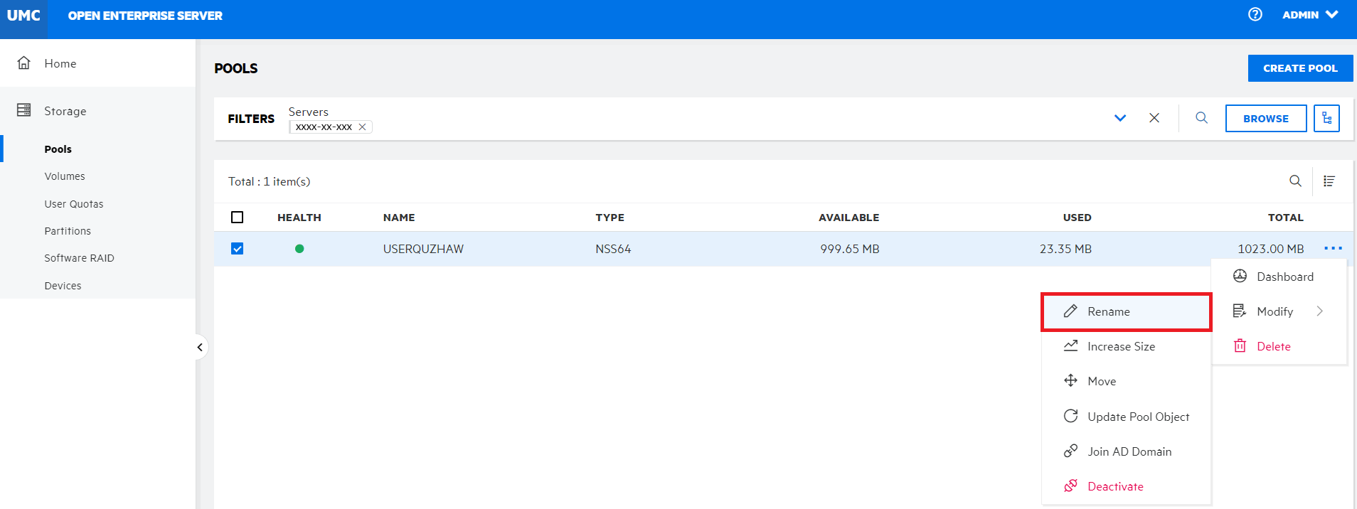 Storage > Pools.