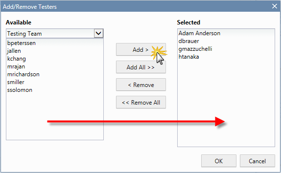 - Cliquez sur OK. Les utilisateurs sont désormais ajoutés à la liste dans la boîte de dialogue Modifier les Testeurs Assignés.