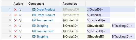 Silk Central mappe automatiquement le paramètre de sortie OrderID du premier composant métier sur les paramètres d'entrée OrderID des composants métier suivants, étant donné que les paramètres portent le même nom.