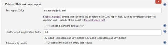 - Dans le champ Fichiers XML de rapport de test, spécifiez l'emplacement dans lequel le script doit écrire dans les fichiers. Par exemple sc_results/junit*.xml.