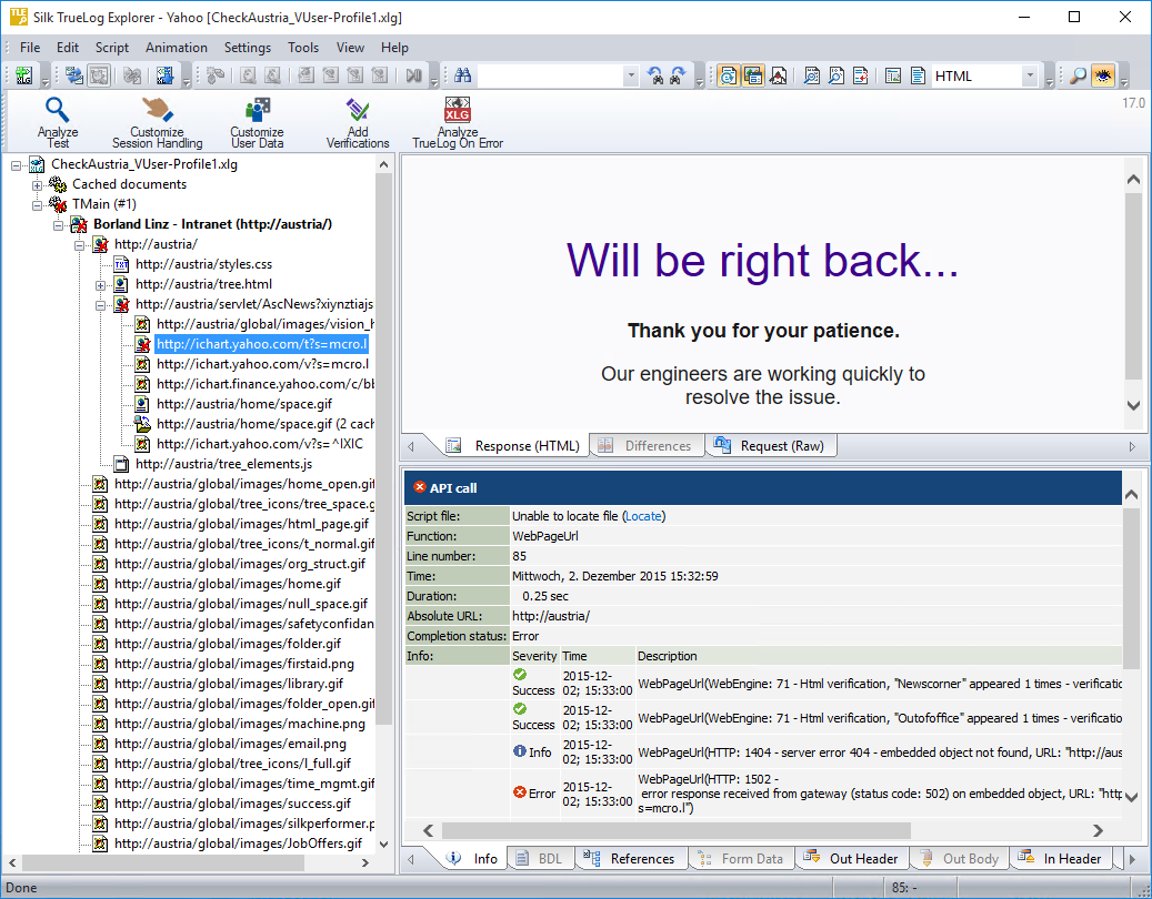 返された Web ページに特定のリンクが含まれていないため リンクが見つかりません というエラーが表示された場合に、仮想ユーザーに対してアプリケーション レベルのエラーが発生する可能性があります。Web サーバーが完全な Web ページを返せなかったのかもしれませんし、アプリケーション サーバーがページの動的コンテンツをタイミングよく渡せなかったのかもしれません。TrueLog Explorer を使用して、このようなエラーの発生前に記録された TrueLog 履歴を分析すると、エラーの原因となったクリック パスを視覚的に調べることができます。エラーの根本原因を特定して根本的な修正を行う上で、この TrueLog 履歴は非常に有益な情報となります。